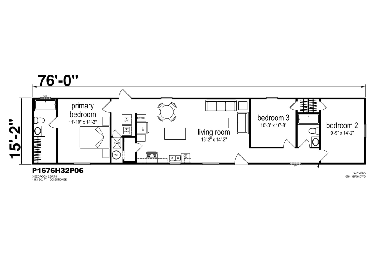 BEDS: 3     BATHS: 2     SQ FT: 1153     W X L: 15′ 2″ x 76′ 0″